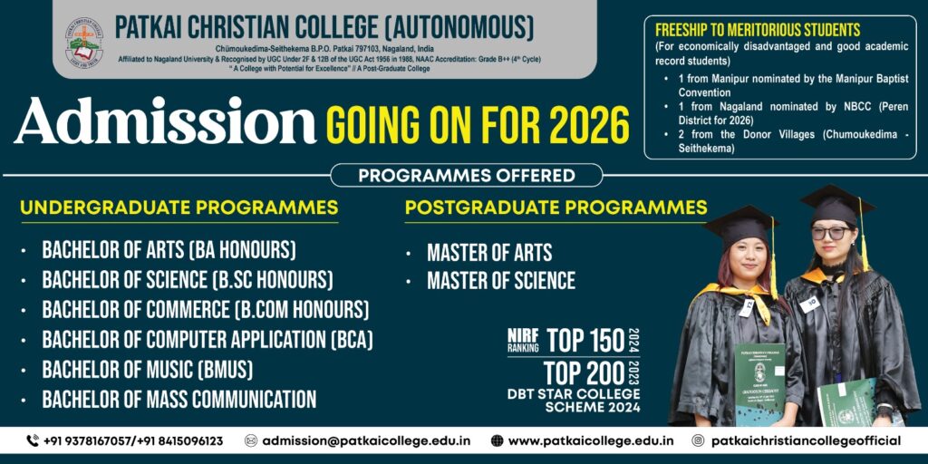 In adherence to the National Education Policy (NEP) 2020, Patkai Christian College is introducing a revised Curriculum and Credit Framework for Undergraduate Programmes (CCFUP). This is based on the University Grants Commission’s (UGC) guidelines, with a student-centric focus, flexible choice-based credit system, and a multidisciplinary approach. This framework also provides multiple entry and exit options, facilitating students to align their education with their career aspirations by choosing subjects/fields of their interest.